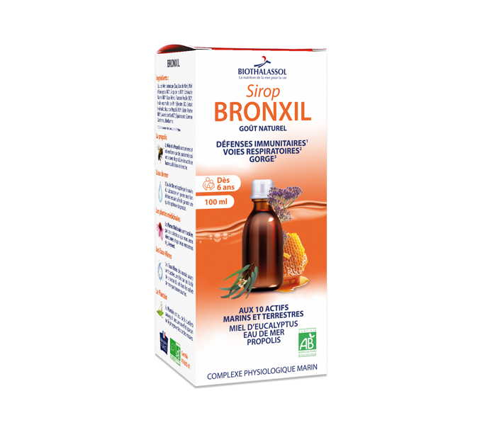 BRONXIL est un Complexe Physiologique Marin associant 10 plantes terrestres et des actifs marins pour soutenir l'immunité. BRONXIL est un sirop aidant à maintenir un système immunitaire sain, à atténuer les maux de gorge, et à apporter un effet apaisant sur les voies respiratoires.