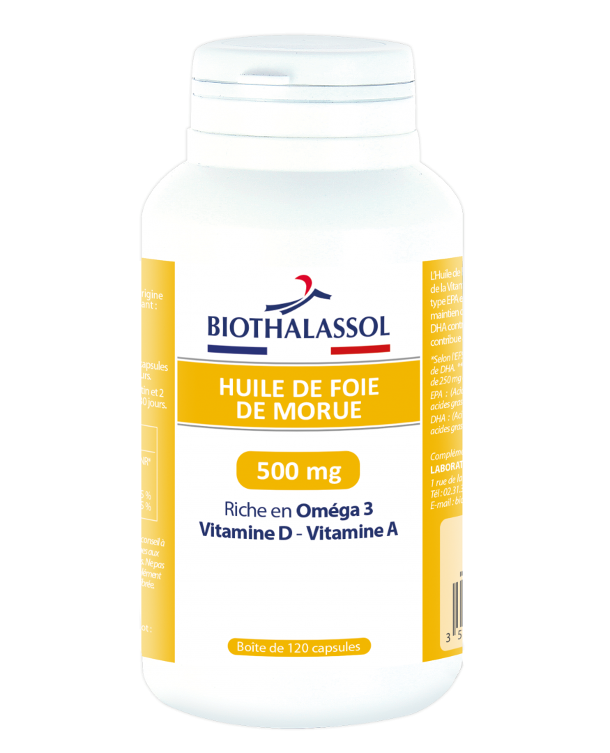 L’Huile de Foie de Morue contient naturellement de la Vitamine A et D. Elle est riche en Oméga 3 de type EPA et DHA.