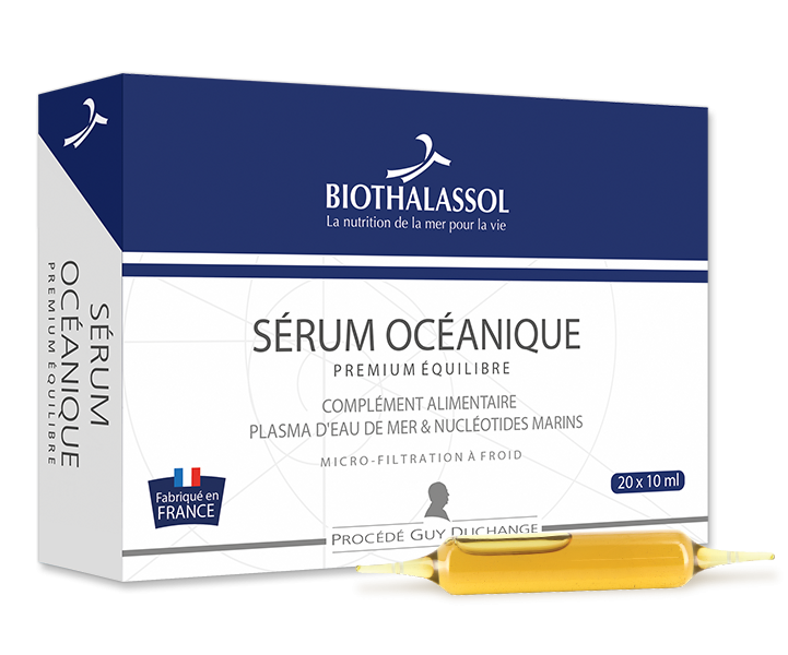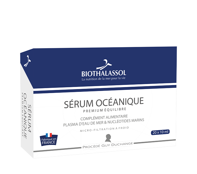 SÉRUM OCÉANIQUE est un Complexe de Micronutrition Marine qui apporte l'ensemble des micronutriments présents dans le Plasma d'Eau de Mer en association avec des nucléotides d'ADN extrait de saumon sauvage. De part sa formule le "SÉRUM OCÉANIQUE - PREMIUM ÉQUILIBRE", est un complexe qui associe le milieu minéral de l'Eau de Mer à la part organique des nucléotides d'ADN de saumon sauvage.